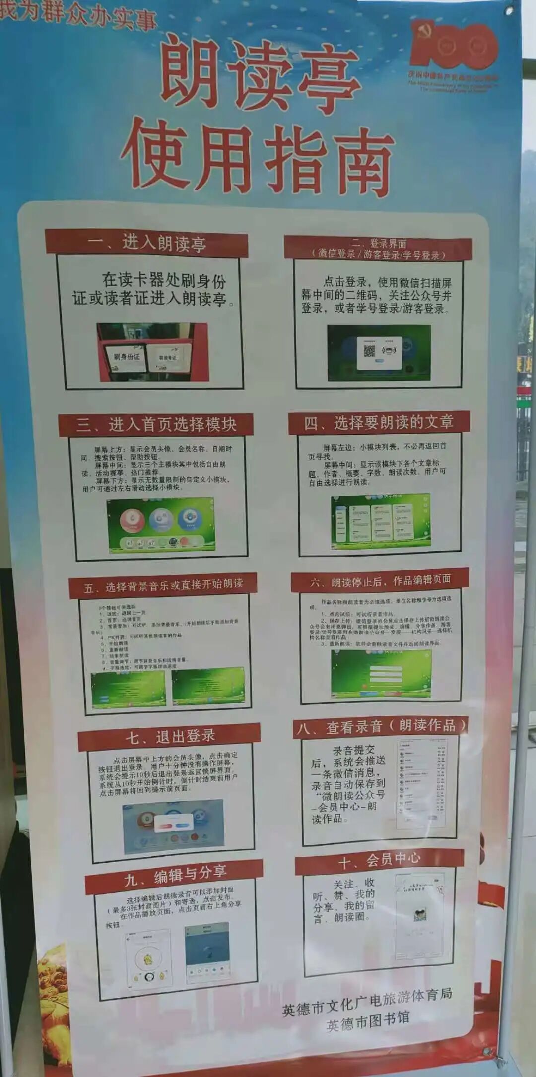 为庆祝中国共产党建党100周年,英德市文化广电旅游体育局结合党史教育,创新党史学习教育模式,以群众需求为切入点,科学布局、倾力打造出新型智能化阅读空间—“朗读亭”。我市共设置两间“朗读亭”,分别安放在英德市图书馆总馆和合地广场,并于2021年6月31日下午在合地广场举办了启用仪式。此次仪式由英德市文化广电旅游体育局、英德市图书馆总馆主办,参与市民共约30人。 朗读亭是由亭身、智能终端设备、前端录音APP,手机微信端,大数据云平台系统、数字资源库,AI测评系统,后台管理等模块组成的线上线下的智能朗读系统平台。市民进入朗读亭空间后,微信扫码登陆系统,可以选择想要朗读的文章进行朗读,也可以直接参与活动赛事,朗读作品可以分享到微信朋友圈。系统涵盖唐诗宋词元曲、诗歌散文、红色经典等各类文库资源5万多篇,能对单个文字的普通话发音做出评测,纠正学生发音容易出错的读音。