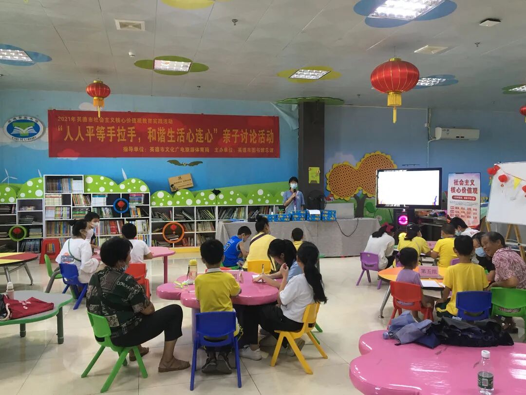 为培育和践行社会主义核心价值观,提高读者对平等的认识。2021年7月14日,由英德市文化广电旅游体育局指导,英德市图书馆总馆主办的“人人平等手拉手,和谐生活心连心”亲子讨论活动,在英德市图书馆总馆亲子阅览室开展,参与本次活动的小读者与家长共有32人次。 小读者们在主持人通过图文并茂的分析与小组讨论中,理解平等的意义,形成平等待人、尊重他人、尊重社会、尊重自然的观念,从而对社会主义核心价值观的平等有一个更深层次的了解。在成语接龙环节中,小读者感受机会平等的意义,展开热烈的小组讨论与积极举手发言。这一环节既锻炼了语言表达能力与胆识,也得到精美小礼品。