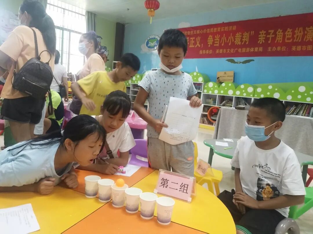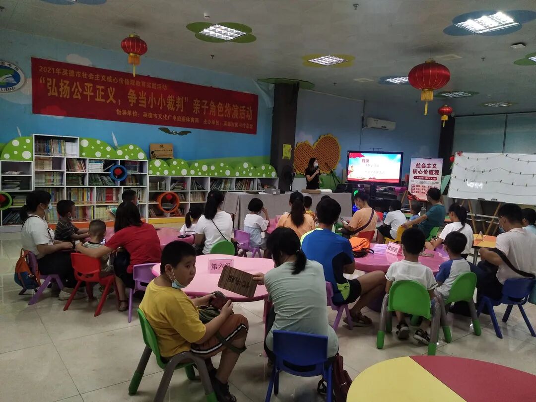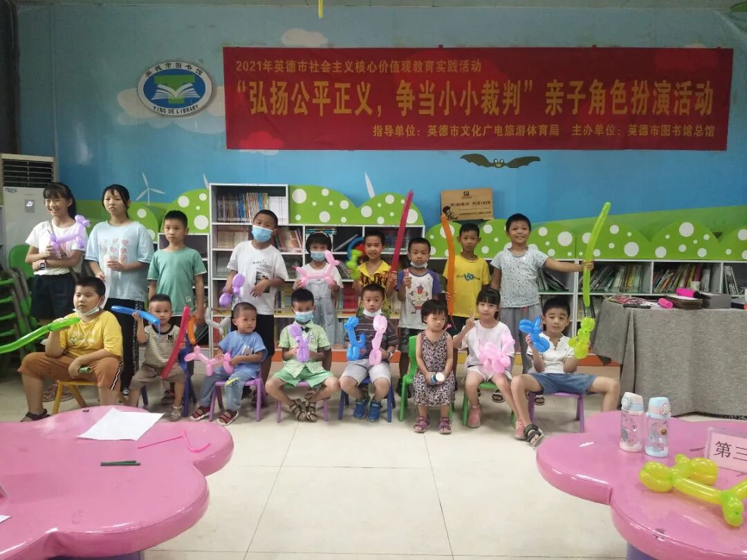 为培育和践行社会主义核心价值观,提高读者对公正的认识。2021年8月14日,由英德市文化广电旅游体育局指导,英德市图书馆总馆主办的“弘扬公平正义,争当小小裁判”亲子角色扮演活动,在英德市图书馆总馆亲子阅览室开展,参与本次活动的小读者与家长共有32人次。